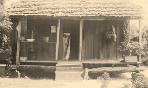 The cabin is rectangular with two rooms off each side where if stood upright the structure resembles a cross.  It’s one-of-a-kind in the piney woods.  To look out a window, canebrakes grow snug against the glass while outside the exterior is clapboard warped and peeling from the tug of vines.  They creep inside and come up through the plank floor.  And where the crossbars meet a deep freeze serves as the only furniture to be found.