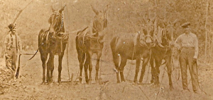 One is Paw Paw . . . hat sloped to one side. They’re driving a mule team plowing through the woods.